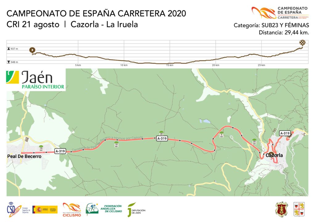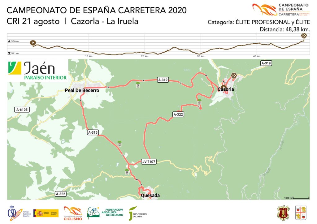 El Campeonato de España arrancará el viernes 21 de agosto con una contrarreloj individual con salida en Cazorla y llegada en La Iruela. Por la mañana se disputarán las pruebas de féminas y sub23 masculina con un recorrido de 29,4 km., mientras que por la tarde como viene siendo habitual tendrá lugar la prueba para profesionales con un largo recorrido de 48 km.