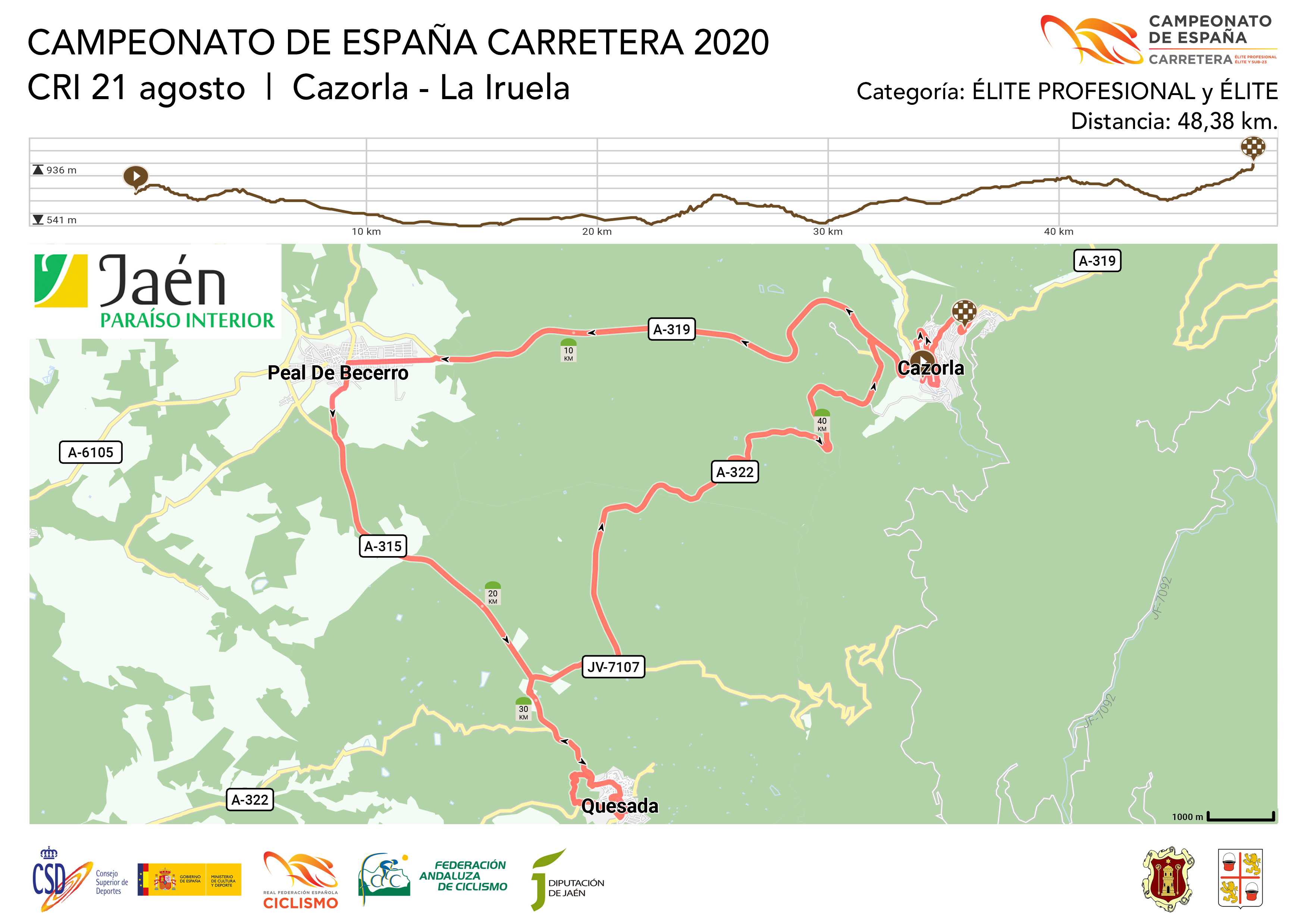 El Campeonato de España arrancará el viernes 21 de agosto con una contrarreloj individual con salida en Cazorla y llegada en La Iruela. Por la mañana se disputarán las pruebas de féminas y sub23 masculina con un recorrido de 29,4 km., mientras que por la tarde como viene siendo habitual tendrá lugar la prueba para profesionales con un largo recorrido de 48 km.