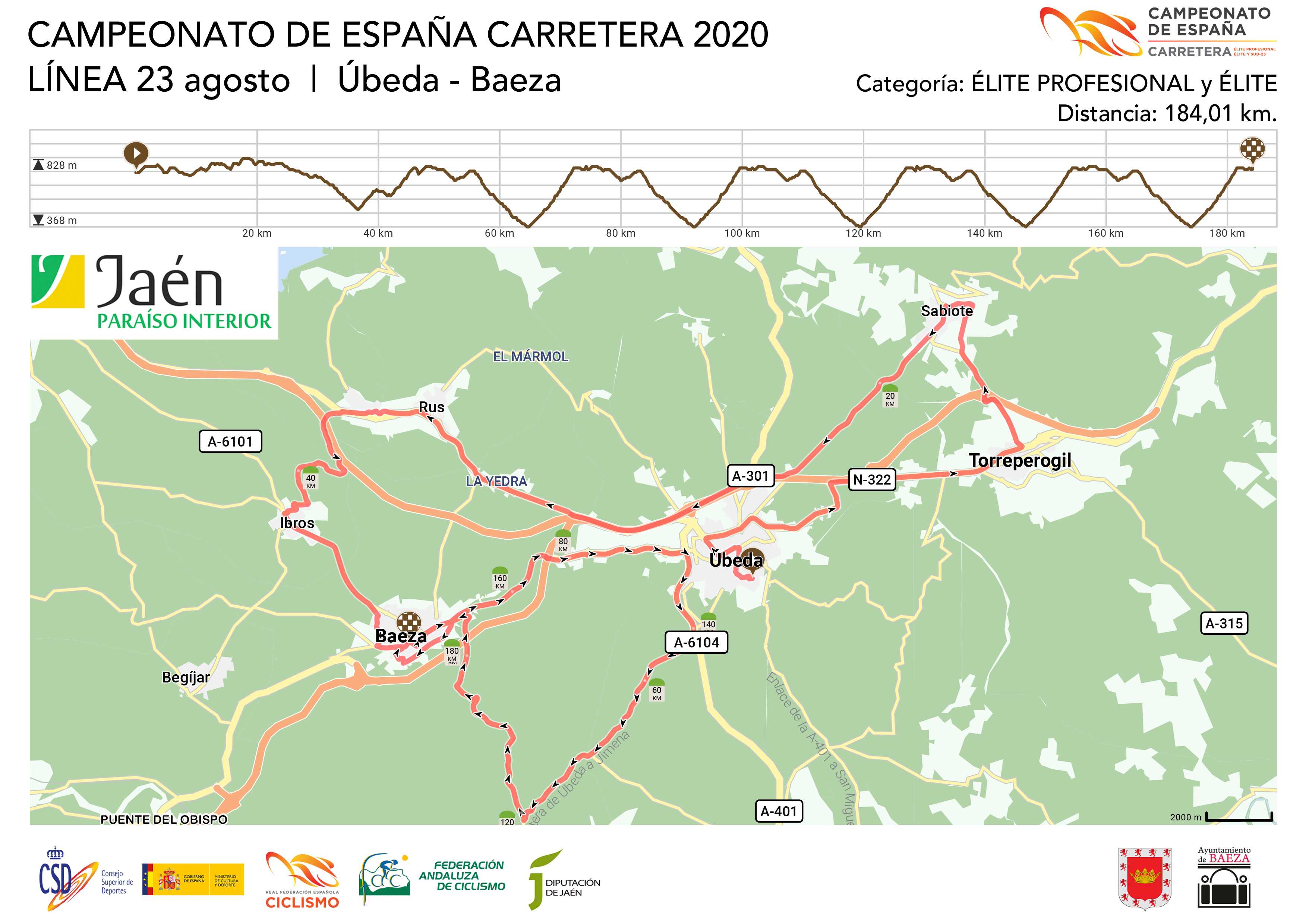 Las localidades jienenses de Cazorla, La Iruela, Úbeda y Baeza serán las sedes del Campeonato de España de Ciclismo en carretera de Jaén 2020, que se celebrará los días 21, 22 y 23 de agosto. La novedad es que las dos pruebas absolutas, la elite femenina (sábado 22 a las 11 horas) y la masculina (domingo 23 a las 12 horas) serán televisadas por la web de La Liga Sports.