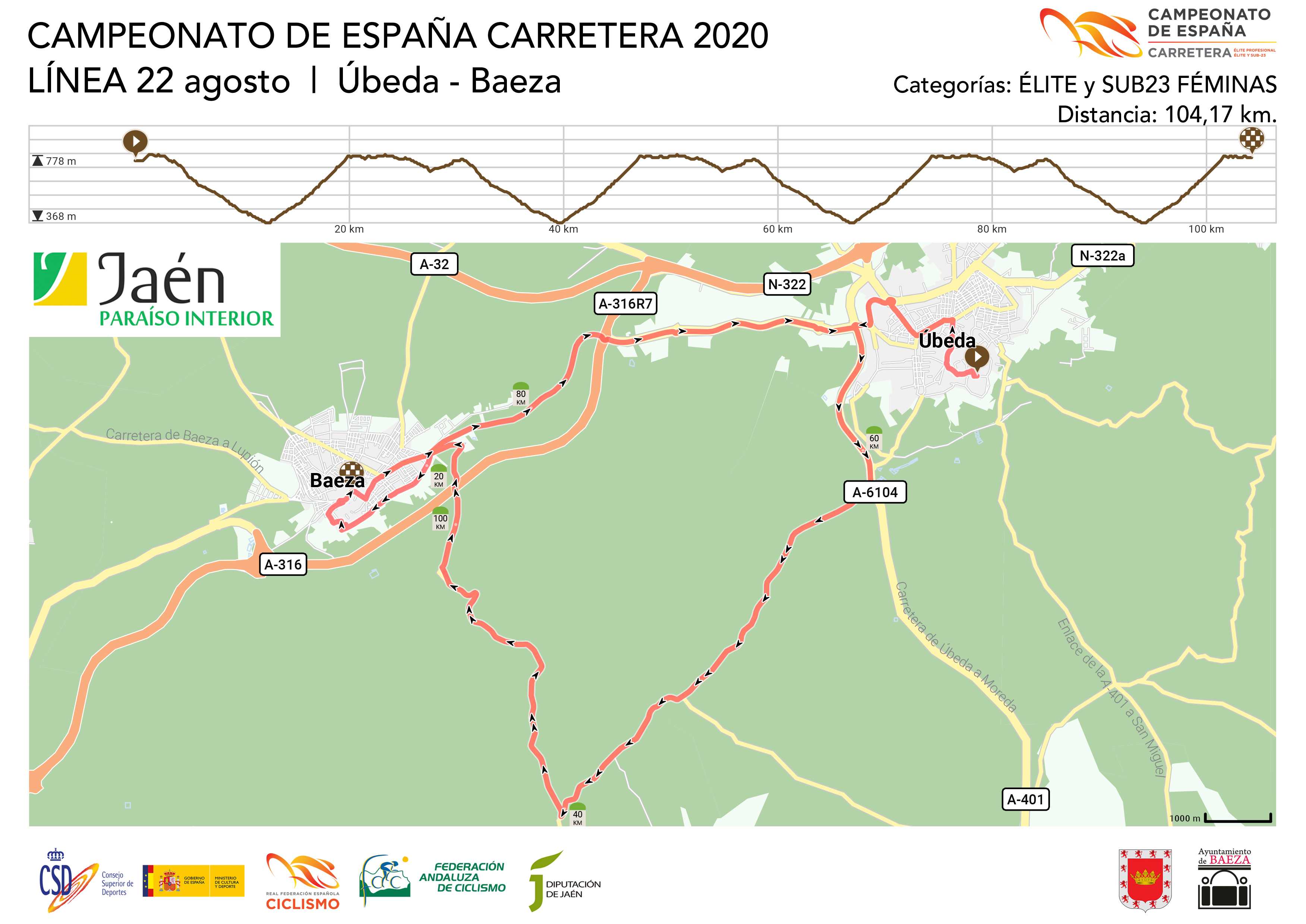 El sábado 22 se celebrará el recorrido en línea para féminas élite y sub-23 y para los sub-23 hombres. Al contrario que en años anteriores, la sesión matutina servirá para proclamar a las nuevas campeonas de España femeninas, que tendrán que hacer frente a 104 kilómetros con salida en Úbeda y llegada en Baeza.