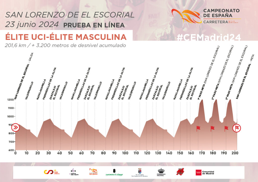 Los participantes en esta prueba en línea Élite UCI-Élite masculina afrontarán un recorrido total de 201,6 km con más de 3.200 metros de desnivel. Un desafío que estará compuesto por cinco vueltas al circuito largo, con sus correspondientes subidas a Fresnedilla de la Oliva, para encarar posteriormente tres giros completos al bucle corto, lo que implicará una triple ascensión a ese primer sector de la subida a Abantos, que decidirá a buen seguro quienes se jugarán el título sobre el repecho empedrado de llegada al Real Monasterio de San Lorenzo de El Escorial.
