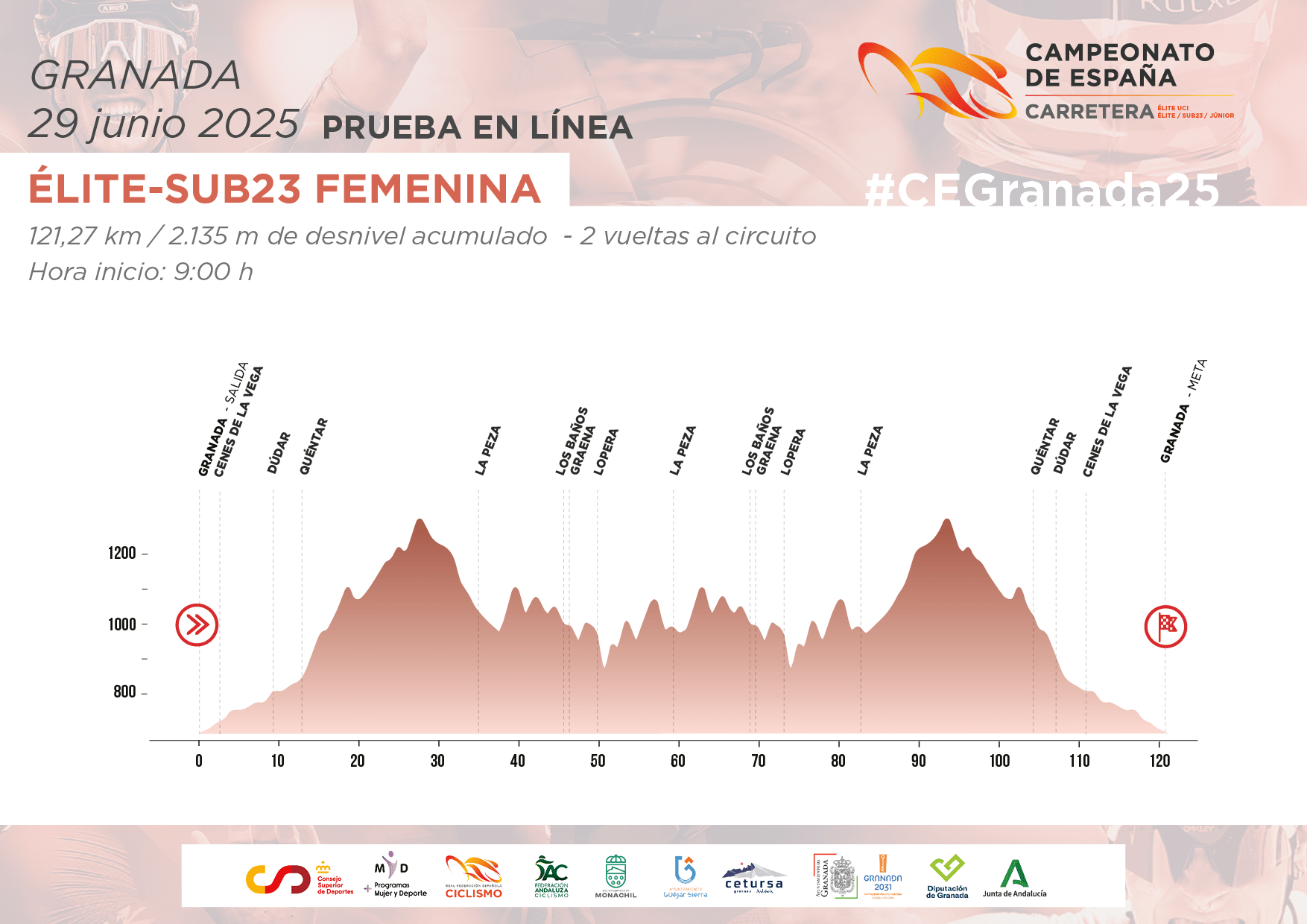 La prueba en línea Élite-Sub23 femenina será la que abra la jornada dominical. El pelotón femenino arrancará desde Granada a las 9:00 h para cubrir 121 kilómetros, con dos vueltas al circuito largo y un desnivel acumulado de 2.135 metros en el que brillarán las ciclistas más fuertes de nuestro país.