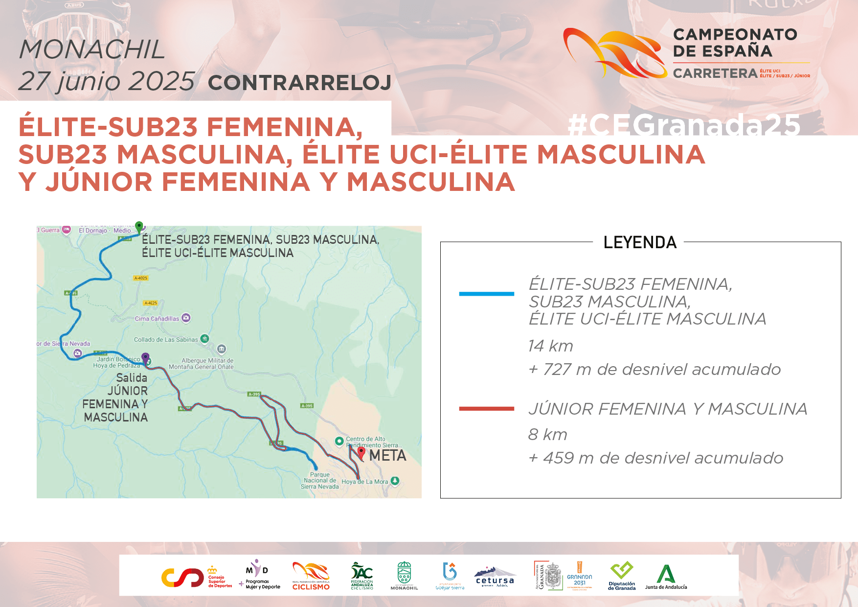 Las carreteras de Sierra Nevada serán las encargadas de coronar a los campeones de España de contrarreloj sobre un trazado de 14 kilómetros con 727 metros de desnivel positivo acumulado para las categorías élite y sub23 (hombres y mujeres), con salida en el Centro de Visitantes de El Dornajo y llegada en el aparcamiento de Los Peñones. Las chicas y los chicos júnior competirán por su parte sobre un recorrido de 8 kilómetros y 459 metros de desnivel positivo acumulado con salida desde el Jardín Botánico y meta también en Los Peñones.