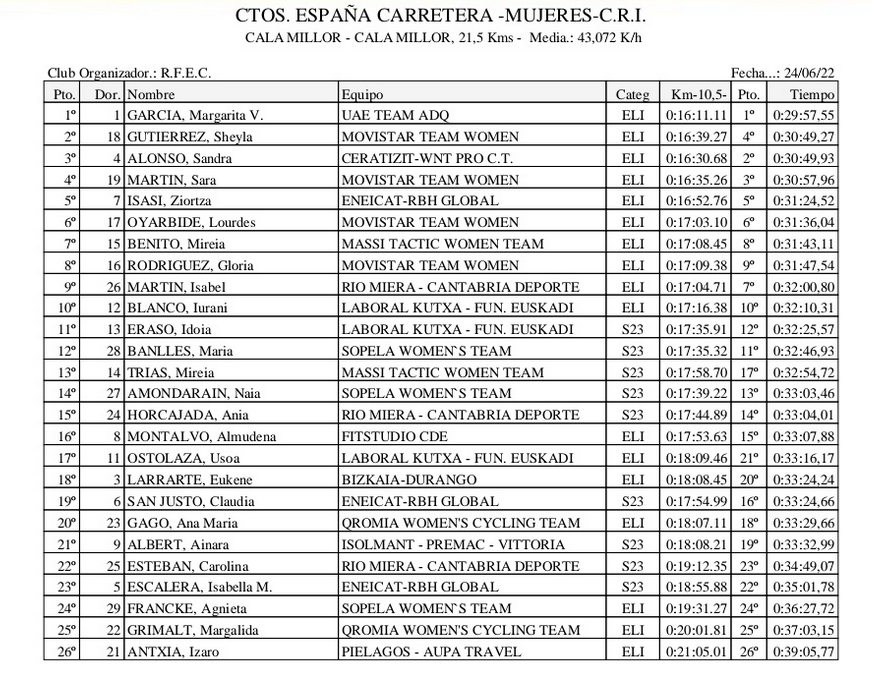 Puntos Top Ciclo 21: Mavi García, 16 (Ganadora Campeonato España CRI) / Sheyla Gutiérrez, 12 (2º Campeonato España CRI) / Sandra Alonso, 10 (3º Campeonato España CRI) / Sara Martín, 8 (4º Campeonato España CRI) / Ziortza Isasi, 6 (5º Campeonato España CRI) / Lourdes Oyarbide, 5 (6º Campeonato España CRI) / Mireia Benito, 4 (7º Campeonato España CRI) / Gloria Rodriguez, 3 (8º Campeonato España CRI) / Isabel Martín, 2 (9º Campeonato España CRI) / Iurani Blanco, 1 (10º Campeonato España CRI)