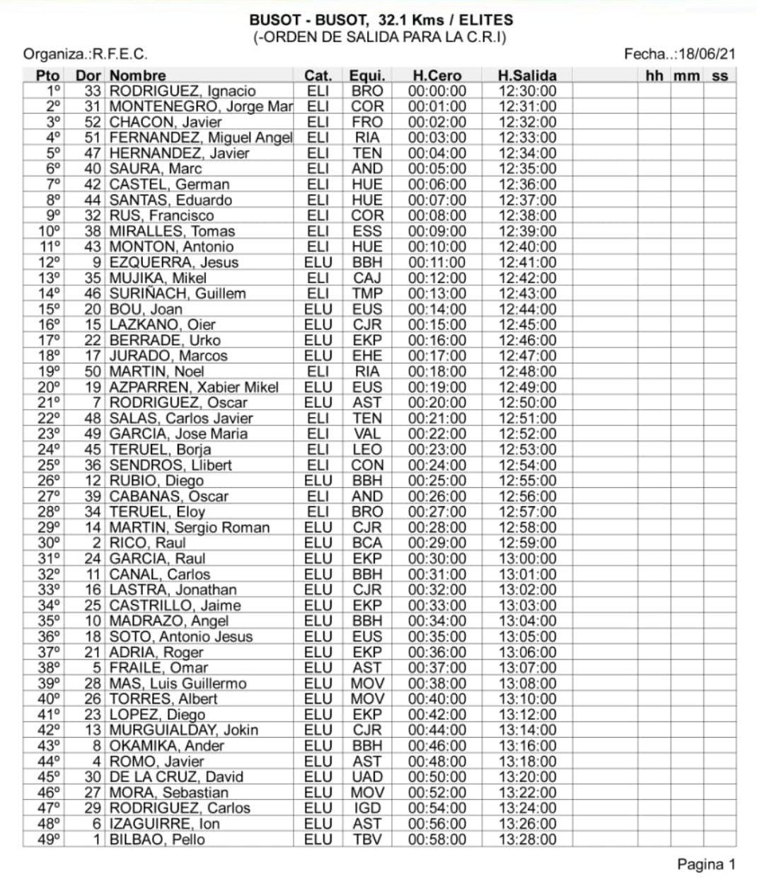 En esta jornada de viernes, también será muy interesante seguir las evoluciones de algunos de los jóvenes valores del ciclismo nacional, como Carlos Rodríguez (Ineos-Grenadiers), que estuvo a gran nivel sobre la cabra en la crono de Dauphine; Xabier Mikel Azparren (Euskaltel-Euskadi), campeón de España sub23 de CRI en 2019; o Raúl García Pierna (Kern Pharma), campeón de España sub23 de CRI en 2020. En lo que respecta a la batalla por el título élite, dos ciclistas sobresalen de forma especial: Eloy Teruel, tres veces campeón de España de CRI élite, y Noel Martín, bien conocido por su capacidad rodadora.