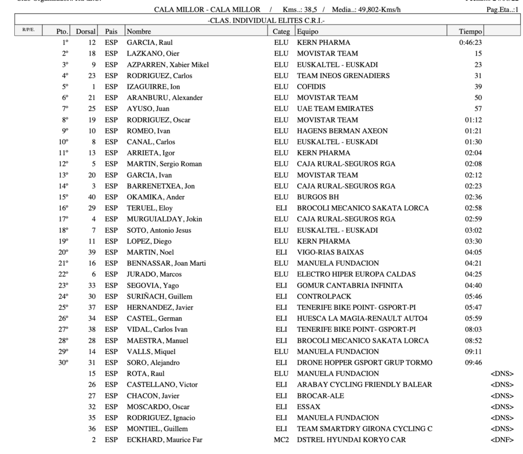 Puntos Top Ciclo 21: Raúl García 16, (Ganador Campeonato España CRI) / Raúl García, 1 (mejor sub-26) / Oier Lazkano, 12 (2º Campeonato España CRI) / Xabier Mikel Azparren, 10 (3º Campeonato España CRI) / Carlos Rodríguez, 8 (4º Campeonato España CRI) / Ion Izagirre, 6 (5º Campeonato España CRI) / Alexander Aranburu, 5 (6ºCampeonato España CRI) / Juan Ayuso, 4 (7º Campeonato España CRI) / Óscar Rodríguez, 3 (8º Campeonato España CRI)), Iván Romeo, 2 (9º Campeonato España CRI) / Carlos Canal, 1 (10º Campeonato España CRI) /