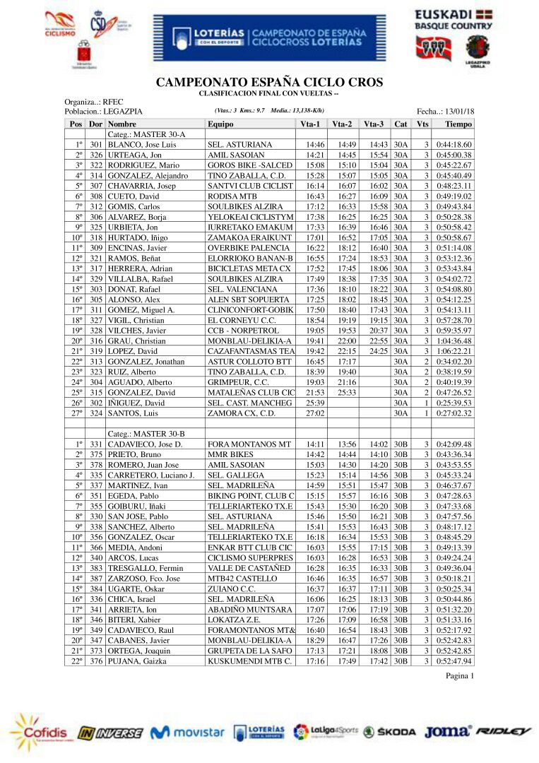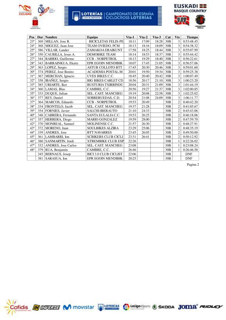 La primera de las dos pruebas de tarde, la que agrupaba a los Máster 30, ha estado muy determinada por la ausencia de lluvia, que ha provocado que el barro se fuera apelmazando y las condiciones del circuito se endurecieran notablemente. Ello provocó una gran igualdad en la primera vuelta que no impidió a José Domingo Cadavieco cruzar el primer giro en cabeza, posición que ya no cedería en ningún momento para cumplir con su condición de favorito y hacerse con el triunfo. El segundo clasificado absoluto, ya a más de un minuto, fue Bruno Prieto; mientras que Juan José Romero se hizo con la tercera plaza. Los tres primeros clasificados fueron también los tres integrantes del podio Máster 30B, al tiempo que José Luis Blanco, Jon Urteaga y Mario Rodríguez completan el cajón de la categoría Máster 30 A.