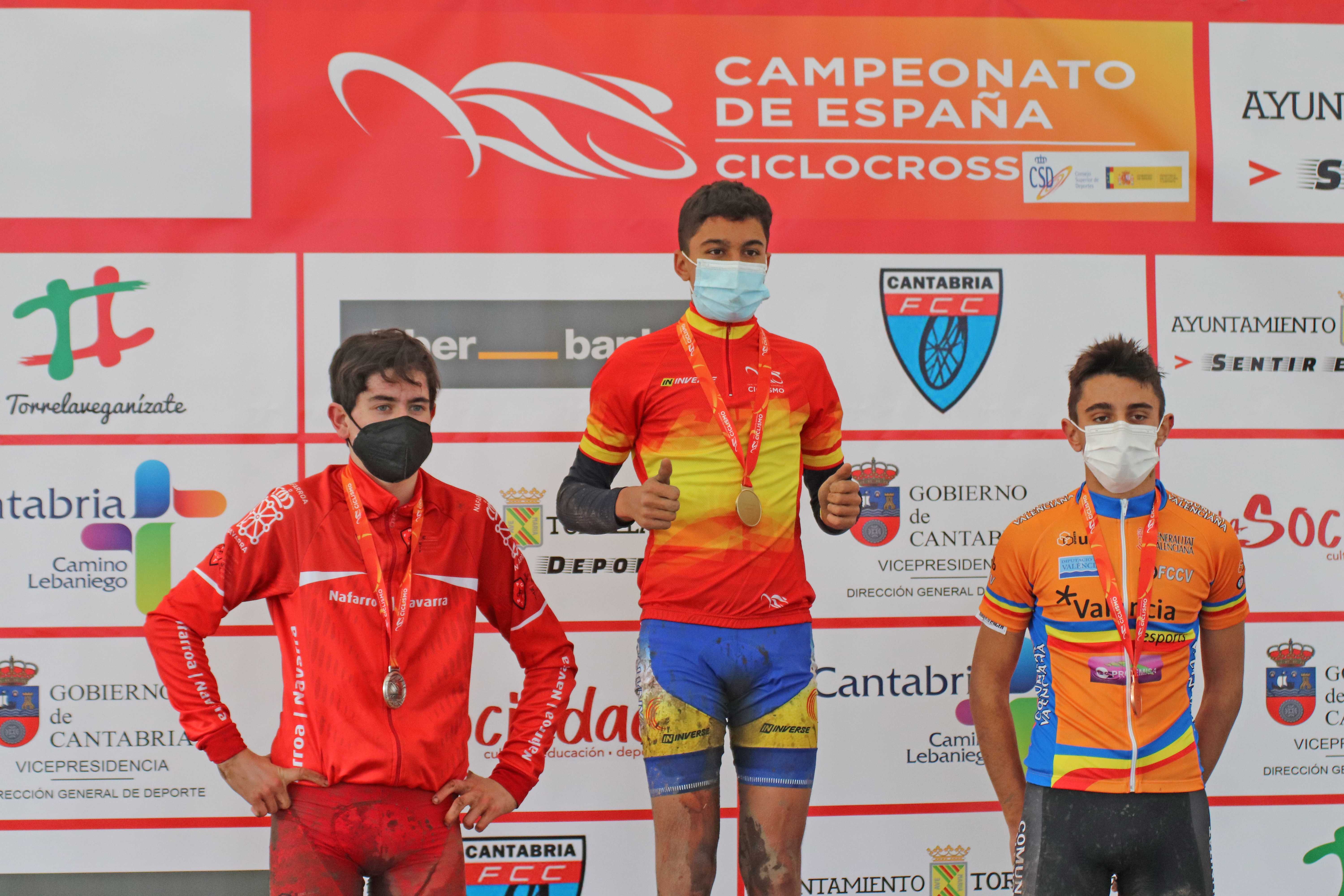 La acción arrancaba a las 14:00 h. en las inmediaciones del complejo deportivo Óscar Freire con la disputa de la carrera cadete masculina, en la que la excelente participación (alrededor de 80 corredores) y el gran nivel hacían presagiar una bonita disputa por el título. Cuatro hombres lograron destacarse en la primera vuelta: el catalán Carlos Gámez, Adrián Valle (Comunidad Valenciana), el cántabro Rumayor y el vasco Corres. Ya en el segundo giro, Gámez y Valle lograban destacarse sobre el resto, con el navarro Regil acercándose desde atrás, completando una excelente carrera de menos a más. El catalán Gámez lanzaría el ataque definitivo en la última vuelta, logrando marcharse en solitario para convertirse en campeón de España por delante de Regil, que entraba 17 segundos después, y Valle, bronce a medio minuto.