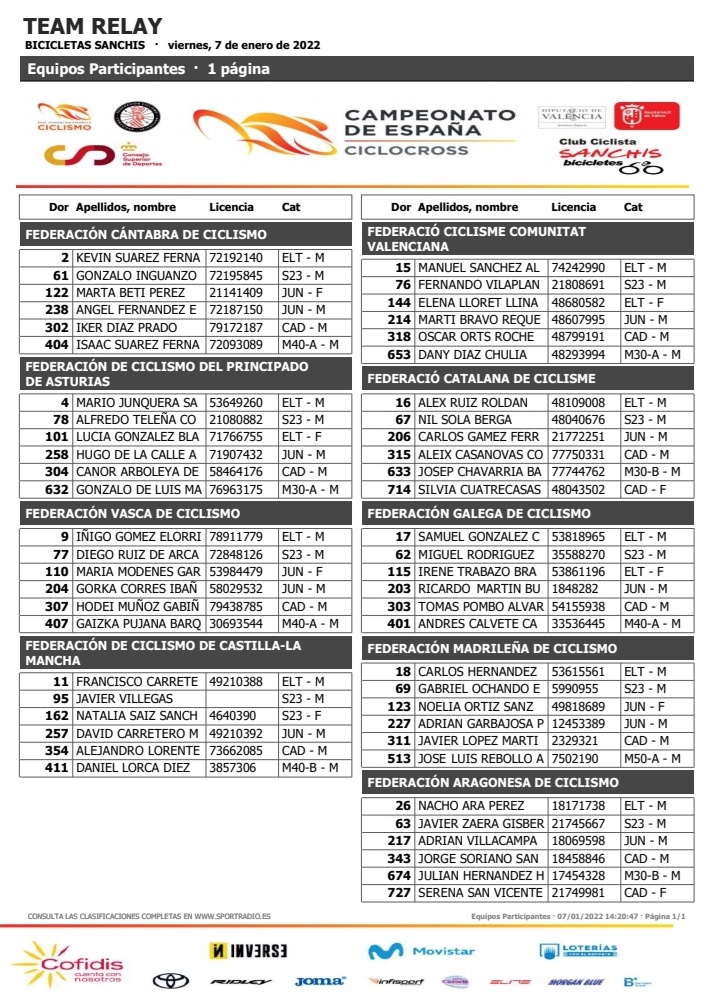 El Campeonato de España de Ciclocross ha dado comienzo con una emocionantísima prueba de Team Relay en la que la Selección Gallega se ha hecho con la medalla de oro tras un precioso duelo en la vuelta final con el combinado asturiano. La igualdad ha sido máxima entre los equipos autonómicos participantes, pues en escasos 40 segundos han concluido las cinco primeras escuadras. Un inicio espectacular para este nacional de ciclocross de Xátiva que se está desarrollando sobre el circuito instalado en el Poliesportiu Municipal “Les Pereres”.