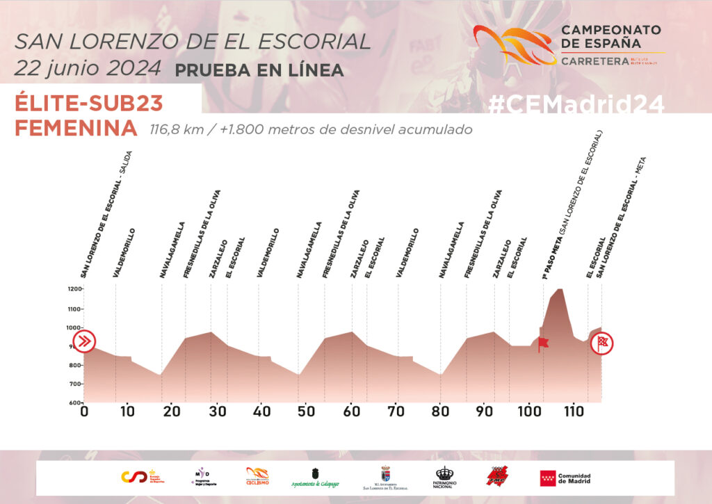 Los maillots de campeona nacional élite y sub23 de ruta se pondrá en juego a partir de las 9:30 h sobre un recorrido que con 116,8 km y más de 1.800 metros de desnivel. Tras partir de San Lorenzo de El Escorial, el pelotón femenino dará tres vueltas a un bucle largo que las conducirá por Valdemorillo y Navalagamella, desde donde realizarán en cada uno de los giros el ascenso hasta Fresnedilla de la Oliva, para regresar de nuevo a San Lorenzo de El Escorial, donde iniciarán las dos vueltas al circuito corto. En este, transitarán por las calles del municipio y afrontarán el tramo inicial de la subida a Abantos, hasta la calle del Pinar, donde a buen seguro se romperá de forma definitiva la carrera antes de coronar a la vencedora frente al Real Monasterio de San Lorenzo de El Escorial.
