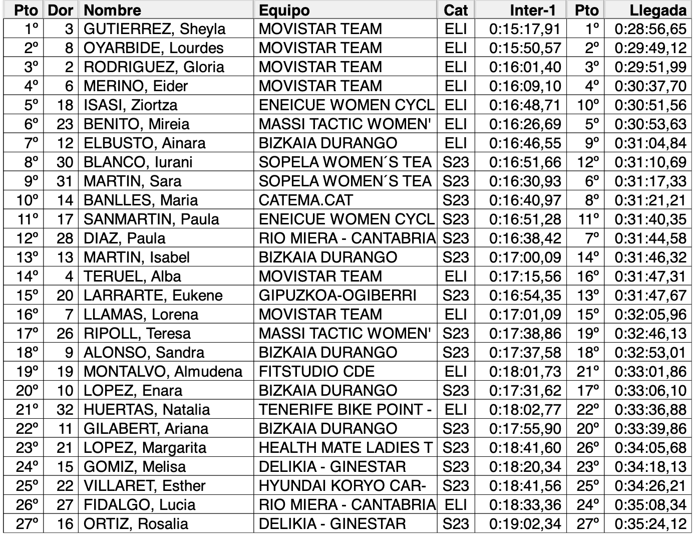 El podio lo completó Gloria Rodríguez, que se ha dado la alegría de subir al podio ante sus familiares y amigos, y Eider Merino, que ha finalizado en cuarta posición a algo más de minuto y medio de Sheyla Gutiérrez. La primera ciclista no perteneciente a la estructura telefónica ha sido Ziortza Isasi (Eneicat), que ha completado una gran contrarreloj para finalizar entre las cinco mejores.