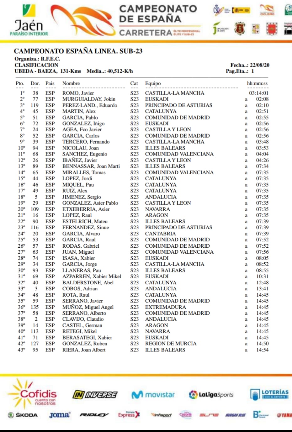 El propio corredor vasco sería finalmente quien conseguiría hacerse con el premio de la batalla por la medalla de plata al alcanzar al Landaluce a escasos kms para el final. El vasco pudo ser en meta el mejor del resto de la carrera viendo la coronación de un intratable Romo en el recorrido jienense.