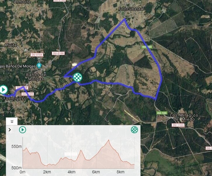 La salida y llegada de la prueba estará ubicada en El Albergue Turístico Moncho Borrajo, en Baños de Molgas. Se realizaran 2.3 Km hasta la entrada en el circuito. EL circuito tiene una distancia total de 6.7 al que se deberán dar un total de 10 vueltas. En la última vuelta el trayecto de regreso a la estación será el mismo que el de la salida.