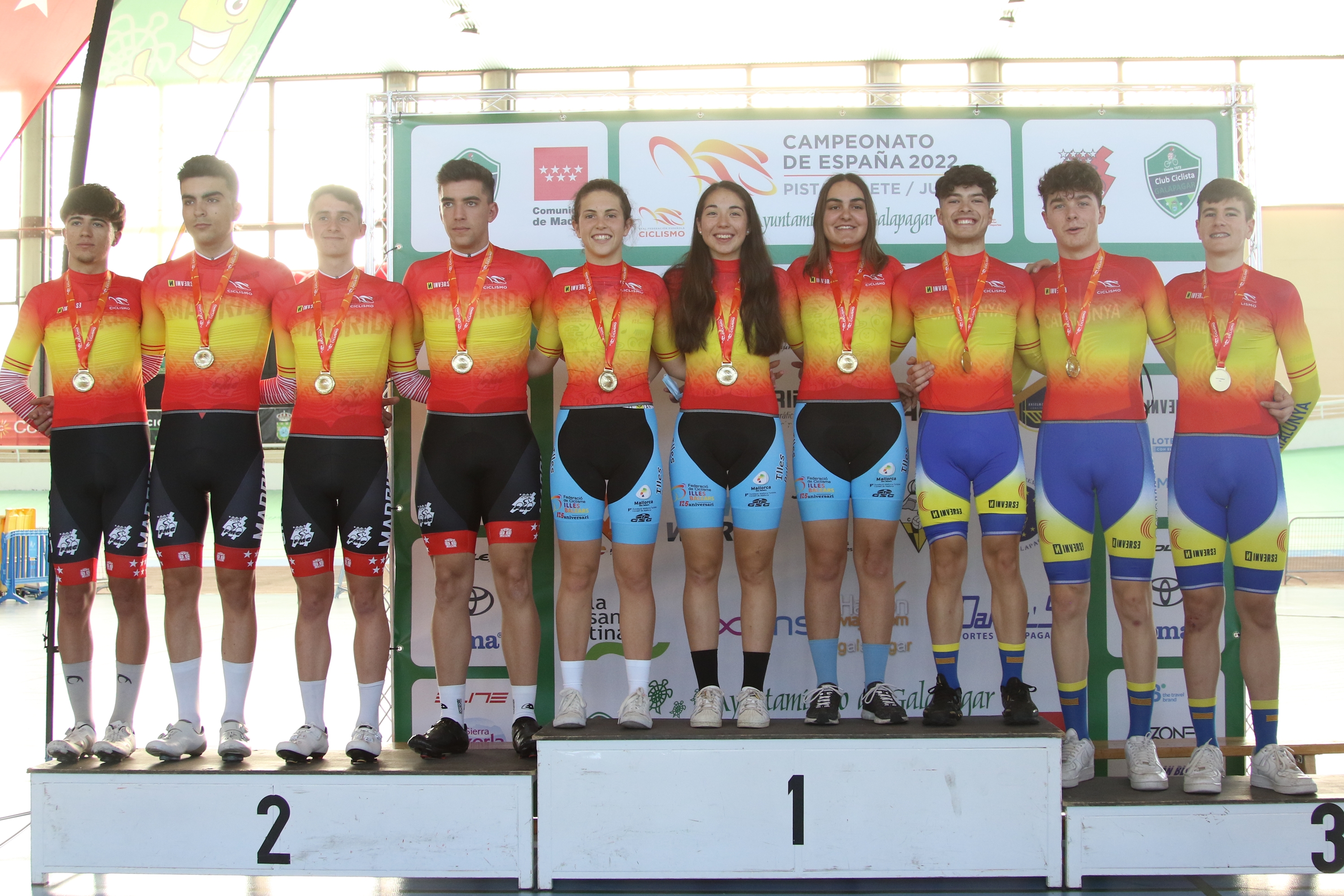 Las pruebas por equipos ocuparon la primera parte de la sesión de tarde de los Campeonatos de España de pista en Galapagar, con dos triunfos de la Comunidad Valenciana y uno de Madrid en las persecuciones, y reparto entre Baleares, Cataluña y nuevamente Madrid en las velocidades.