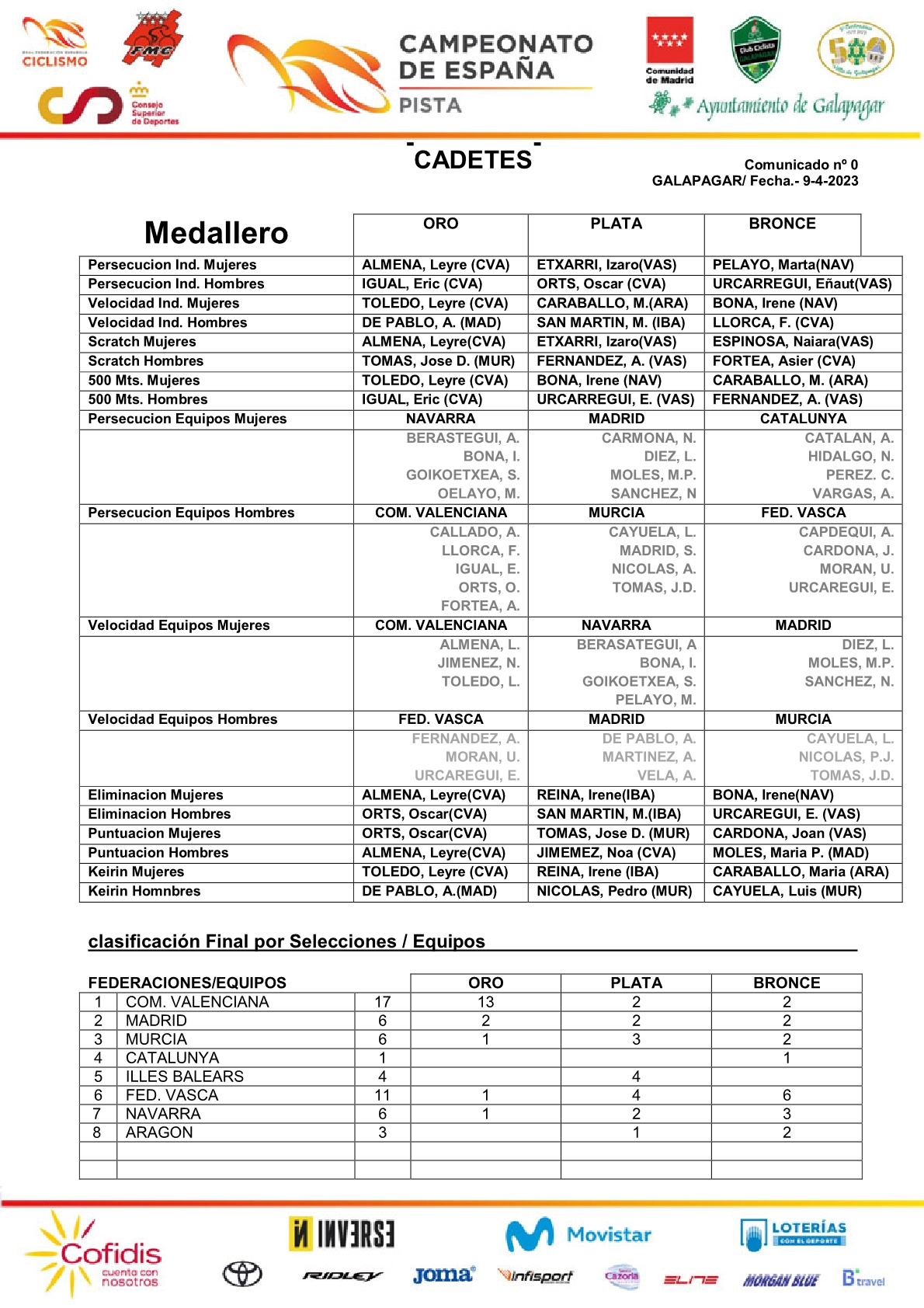 El resto de triunfos fueron para Madrid en las dos pruebas junior masculinas, y con su corredor Rafael Martínez, que había intervenido también en ambos equipos, en la eliminación; para Navarra, en la cadete femenina; para Baleares, en la velocidad junior femenina, y para Euskadi en la cadete masculina.