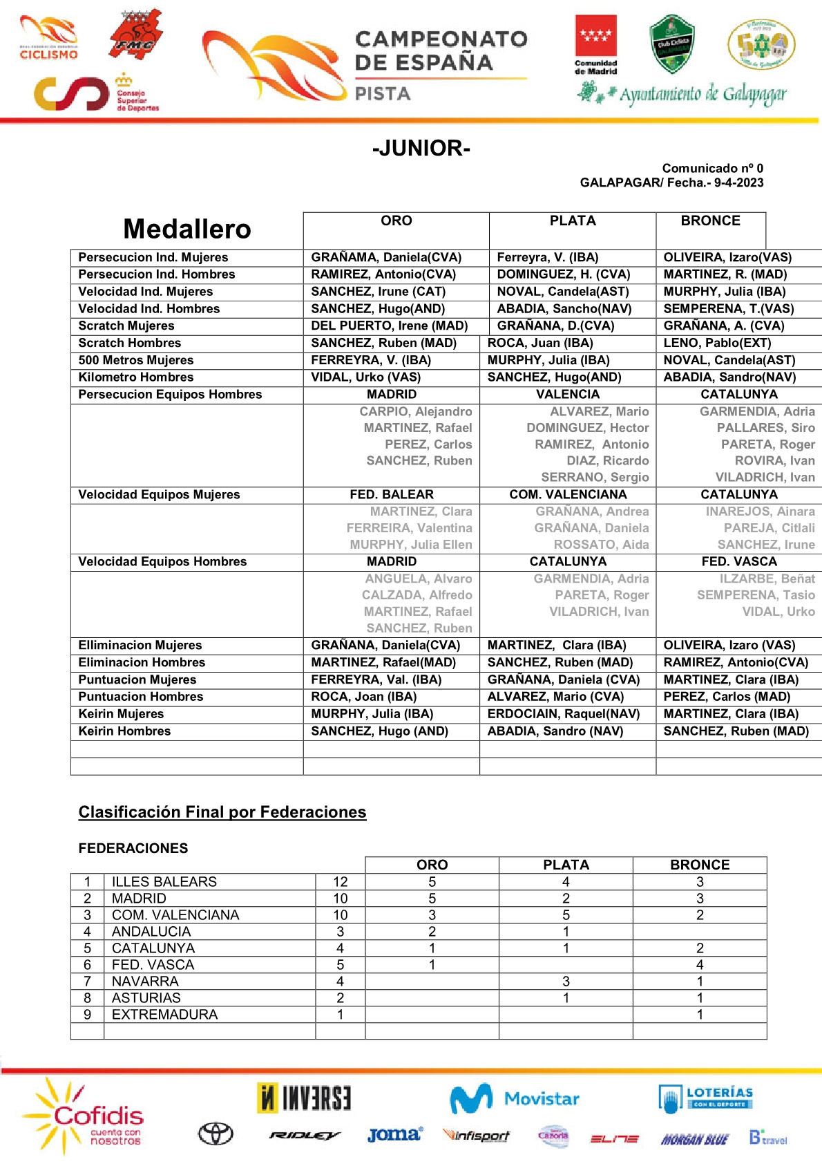 En la primera de ella, pleno valenciano con los con los cadetes Leyre Almena y Eric Igual y los juniors Daniela Grañana y Toni Ramírez; en cuanto al scratch, Almena repetía con victorias, donde también ganaban el murciano José David Tomás, y los madrileños Irene del Puerto y Rubén Sánchez.