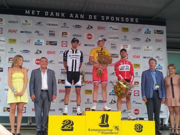 Arnaud Démare, el francés del fdj.fr, se ha impuesto en el Campeonato de Flandes, prueba belga 1.1 UCI, tras ser el más rápido en el sprint masivo final ante el esloveno Mezgec y el belga Van Genechten. Es su primera victoria con el maillot de campeón de su país.