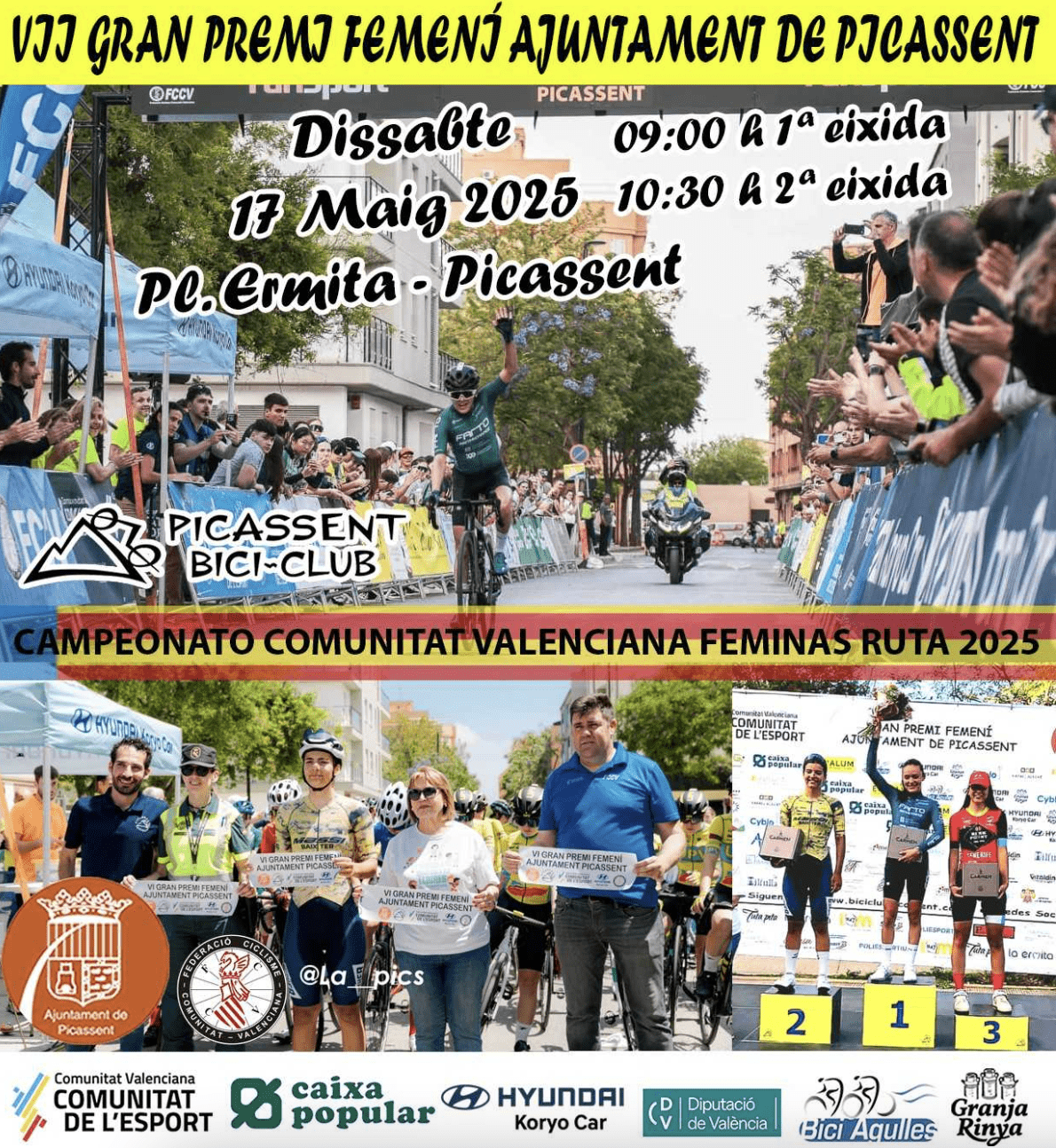 La localidad valenciana de Picassent acogió el pasado sábado 17 de mayo el VII Gran Premi Femení Ajuntament de Picassent, una de las grandes citas del calendario de competición femenina. En esta edición, la prueba también fue escenario del Campeonato Autonómico de Ruta Féminas, bajo la organización del Bici Club Picassent.