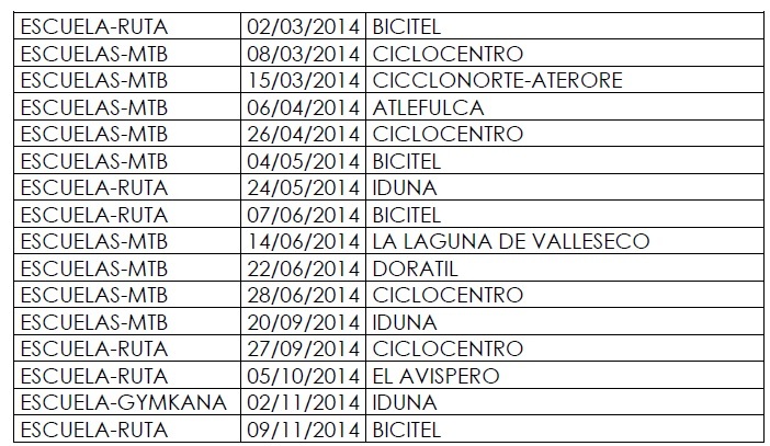 Un total de 16 pruebas componen el calendario del Campeonato de Escuelas Gran Canaria 2014, organizado por la Federación Insular de Ciclismo de Gran Canaria y los distintos clubes con corredores en categorías de escuelas.