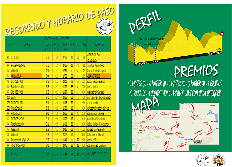 El Club Ciclista Escurialense, junto al Ayuntamiento de El Escorial, organizarán esta longeva prueba que tiene su página de Facebook. El Campeonato madrileño tendrá salida y meta en la avenida de la Constitución de El Escorial y comenzará a las cinco y media de la tarde con la salida de los corredores de las categorías sub-23, elite, máster-30 y máster-40, para completar 93 kilómetros por la Sierra de Guadarrama y los altos de montaña de la Cruz Verde y el Almojón.