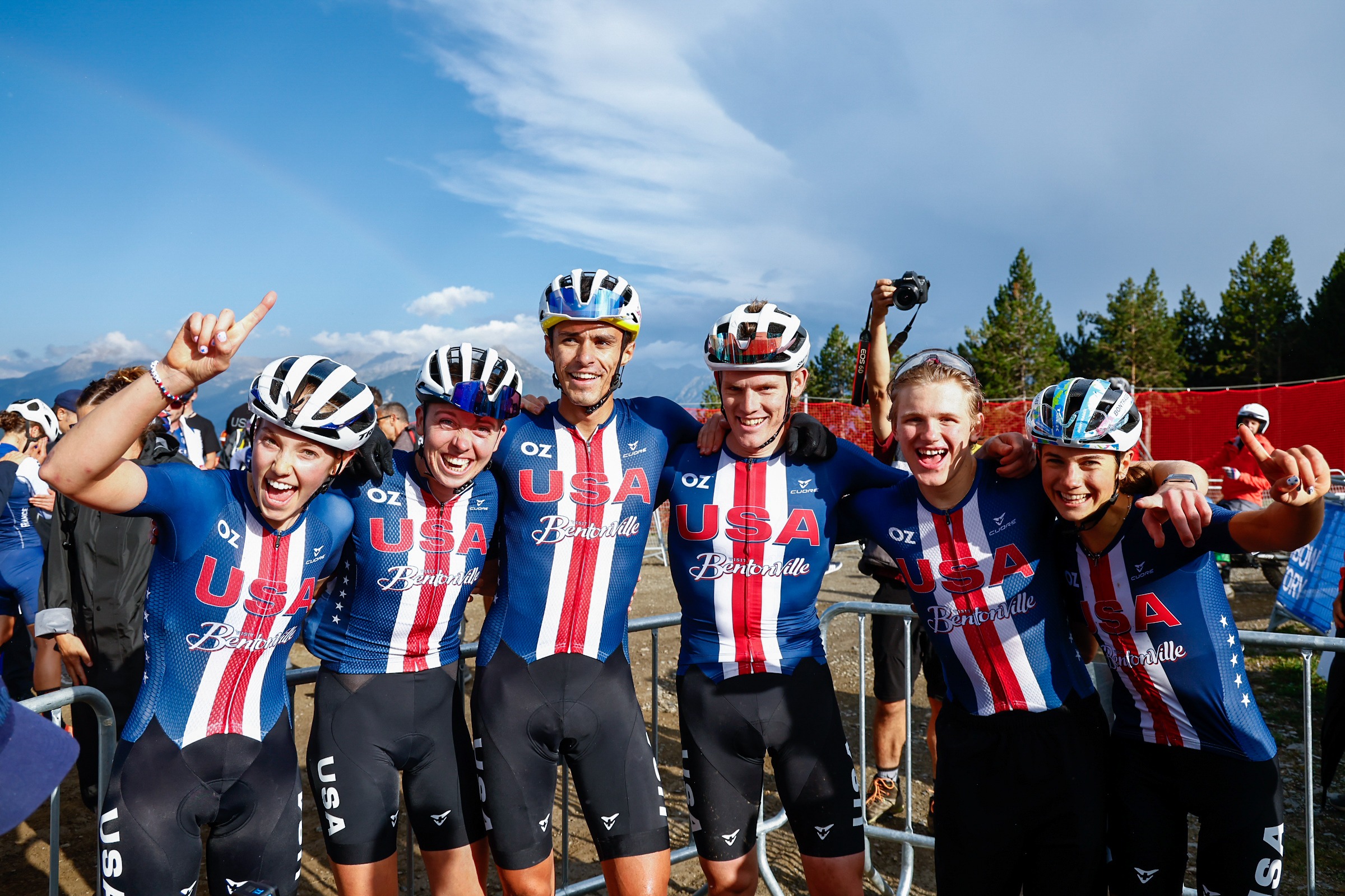 Estados Unidos y Francia protagonizaron un espectacular duelo en la final de relevos mixtos por equipos, que no se decidió hasta prácticamente la línea de meta después de seis vueltas al circuito de 4 kilómetros. En la prueba, los equipos contaban con dos ciclistas júniors, dos U23 y dos Élite (un femenino y un masculino en cada categoría), que hacían cada uno una vuelta y en el área de meta pasaban el relevo a sus respectivos compañeros. Los equipos podían elegir el orden en que salían cada uno de sus corredores, sin importar la categoría o el sexo. El equipo de Francia, conformado por Luca Martin, Nicolas Kalanquin, Loana Lecomte, Olivia Onesti, Anais Moulin y Mathis Azzaro, comenzó luchando por el liderazgo con el equipo italiano, formado por Luca Braidot, Matteo Siffredi, Martina Berta, Giada Martinoli, Valentina Corvi y Mattia Stenico, que puso a sus corredores más fuertes en los primeros relevos.