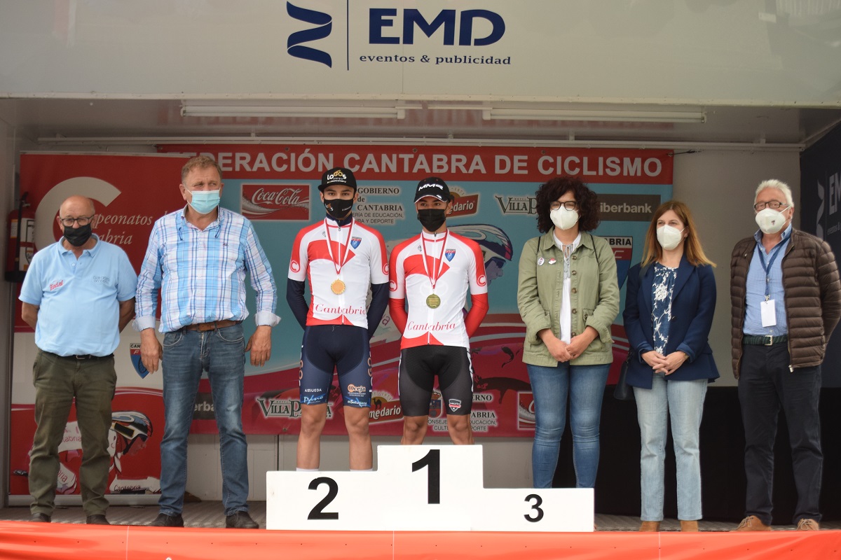 Le acompañan en el podio, plata y bronce) Ismael Rodríguez (Corbatas Pindal-Bicicletas Meta) y Tirso Bra (Disgarsa) que vuelve a colgarse medalla.#CampCantabriaRutaCadete21 pic.twitter.com/5R6s2PRSjj