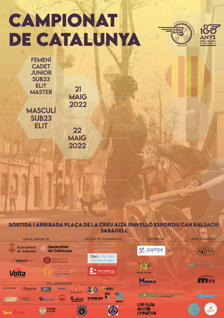 El pròxim cap de setmana del 21 i 22 de maig, Sabadell serà el centre del ciclisme català amb la disputa del Campionat de Catalunya en ruta 2022 per a la màxima categoria, amb dues jornades que ajuntaran la seu per a les fèmines i posteriorment per la categoria elit/sub23 masculina. Dins els actes del centenari de la Unió Ciclista Sabadell, la cocapital del Vallès Occidental serà la seu única per buscar el relleu en el palmarès dels vigents campions absoluts Marc Brustenga i de Iris Gómez.