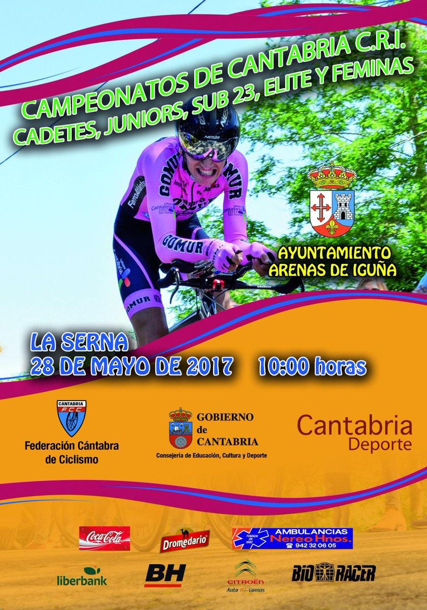 Todo preparado para los Campeonatos de Cantabria CRI que se disputarán el próximo domingo día 28 de mayo en La Serna. La Serna acogerá los Campeonatos de Cantabria contrarreloj individual para las categorías de cadete, junior, sub-23 y elite, tanto masculino como féminas.