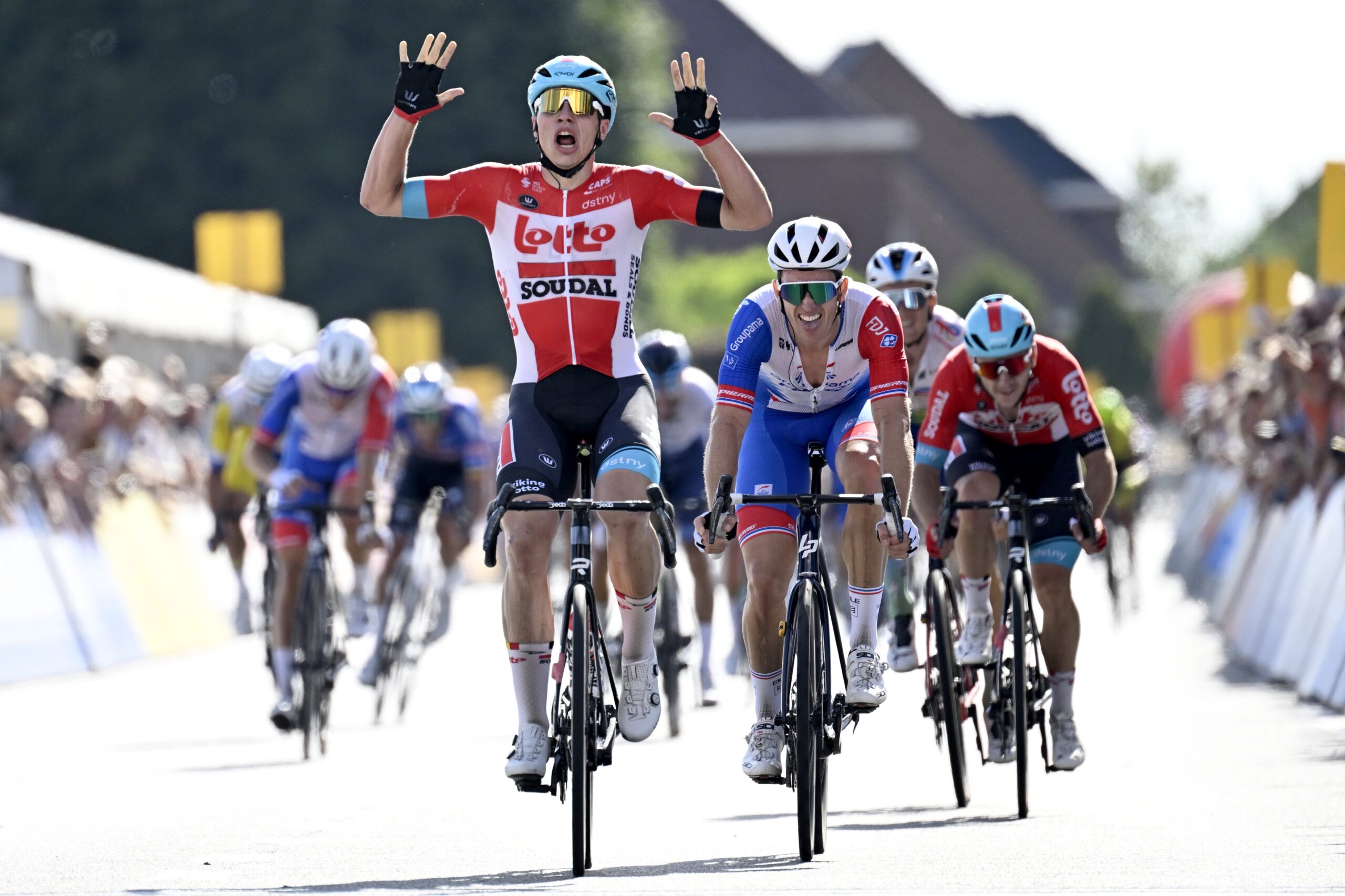 Arnaud De Lie sigue sumando victorias -9 nueve ya esta temporada- y 125 puntos UCI que tan importantes son para Lotto dada su situación por el descenso. El joven de 20 años sigue empeñado en mantener la categoría de la escuadra belga, tirando del carro prácticamente él solito. En esta ocasión, venció al esprint a Arnaud Démare (2º) y a su compañero Jasper De Buyst (3º) que también sumó unos puntos muy interesantes para Lotto.