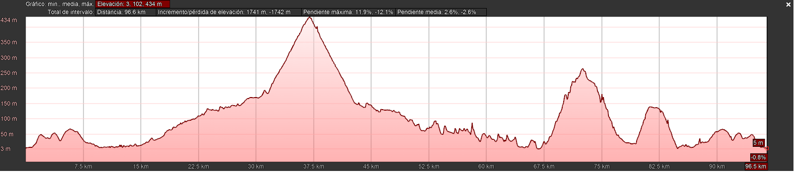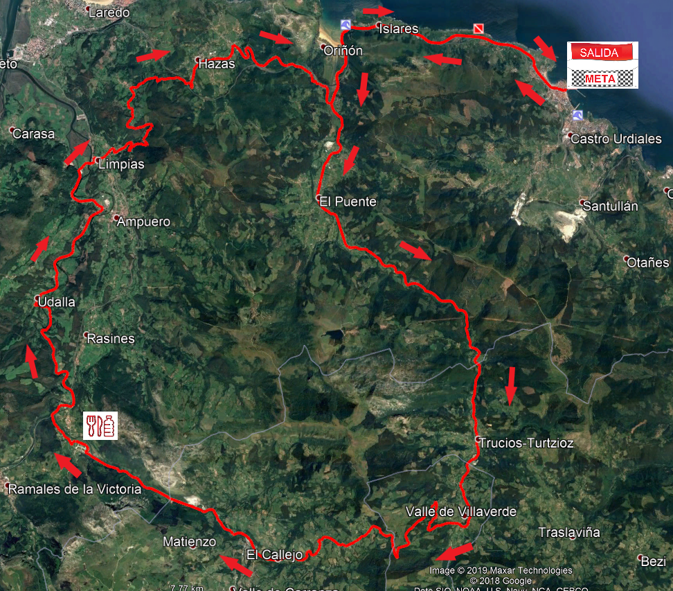 La salida oficial fue a las 9:00h en la Plaza del Ayuntamiento, siendo neutralizada hasta la entrada a Allendelagua (3,3km) N-634 dirección Islares (km 7), el Pontarrón (km 12) se giró a la izqda. por los pueblos de Guriezo, Agüera, Truzios y Villaverde (km 32), giro a la derecha y comenzó el Puerto de la Escrita (km 38) por BI.901 dirección Carranza y Riancho (avituallamiento en el polígono y posible reagrupamiento por la D.G.T. (km 53). Se pasó Gibaja, Udalla y Marron con giro a la izquierda dirección Carasa, giro derecha a Limpias. Aquí comenzó la ascensión al Puerto de Seña .