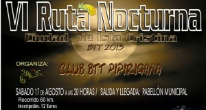 El sábado 17 de agosto, a las 20 horas, la localidad onubense de Isla Cristina será escenario de la VI Ruta Nocturna BTT Ciudad de Isla Cristina, que organiza el club BTT Isleño Pipirigaña sobre un recorrido de 60 kilómetros.