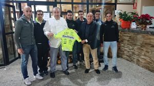 En la imagen de arriba, José Luis Chamorro, Gorka Beloki y los corredores Jorge González, Óscar Justo, Gabriel Ochando, Alejandro de Rozas y Jaime Guzmán posan con el maillot junto al propietario de Casa Aurelia.