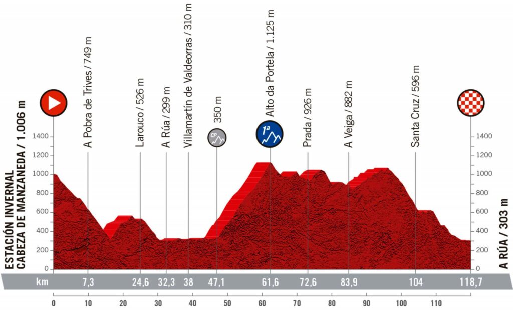 La Challenge by La Vuelta 21 comenzará con una etapa que saldrá de la Estación Invernal Cabeza de Manzaneda y finalizará en la localidad de A Rúa. Un día íntegro en la provincia de Ourense, cuyo recorrido supera los 118 km. y que incluye un paso por el Alto de Portela, de primera categoría.