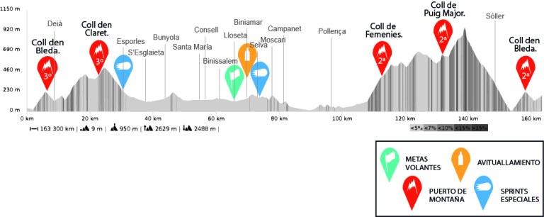 Sóller, Deia, Esporles, S’Esglaieta, Bunyola, Santa Maria, Consell, Binissalem, LLoseta, Selva, Campanet, Pollença, Escorca, Sóller, Deià 160.5 kilómetros.
