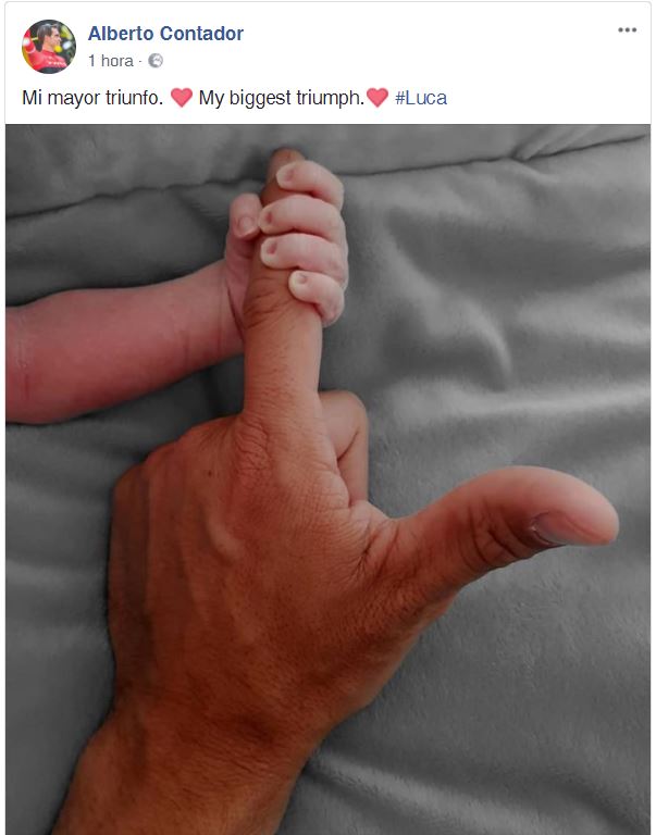 12 abril. Alberto Contador se estrena como padre. El exciclista madrileño ha anunciado el nacimiento de su primer hijo, de nombre Luca: «Mi mayor triunfo», ha asegurado el ‘Pistolero’ acompañando una tierna foto publicada en las redes sociales.