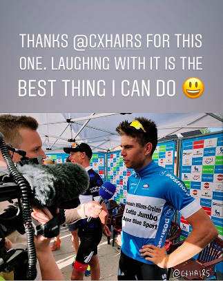 3 agosto. Los muchos y constantes rumores sobre el futuro del actual campeón del mundo de ciclocross, Wout Van Aert, han servido para que el belga vuelva a dar una buena muestra de su buen humor en las redes sociales. Van Aert aprovechó una foto trucada de Instagram para asegurar que «lo mejor que se puede hacer con ello es reirse». La imagen original que Van Aert usó para colgar una historia (imágenes que se borran poco después) se puede ver aquí.