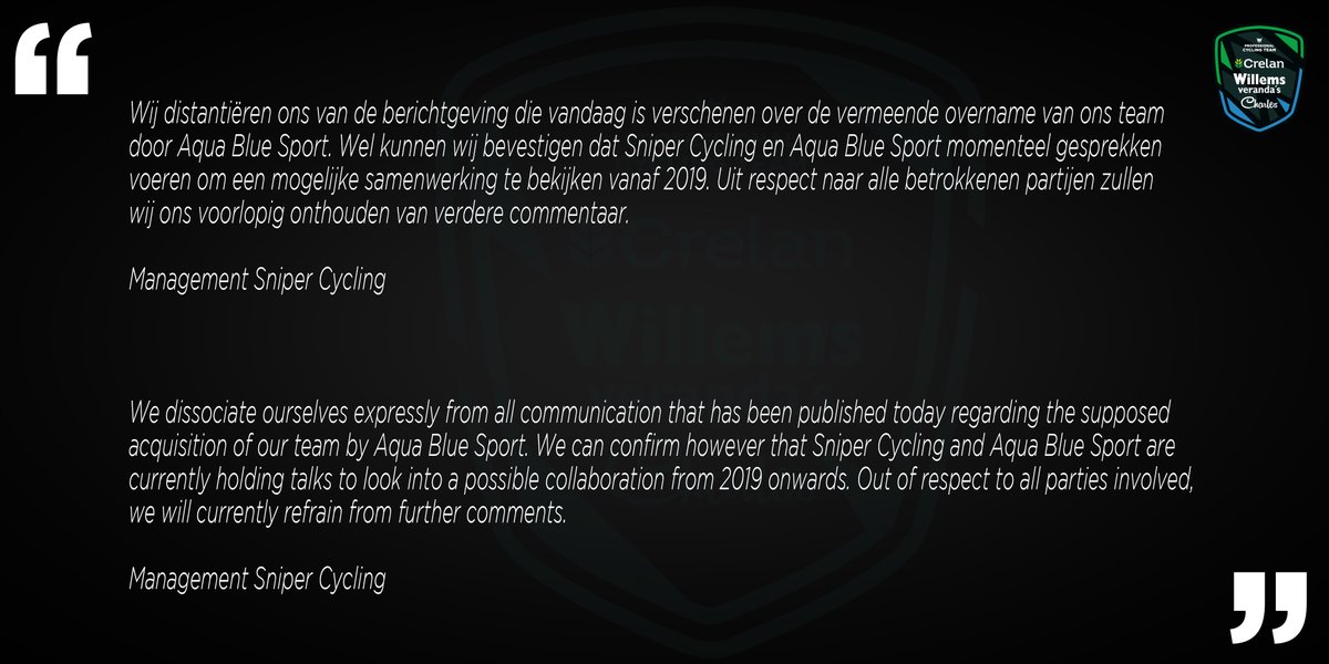 2 agosto. Veranda’s Willems-Crelan niega haber alcanzado un acuerdo con Aqua Blue. Tras filtrarse primero y confirmarse la noticia de la fusión entre ambas escuadras -más exactamente una absorción por parte de la segunda-, el equipo belga ha reconocido que ha habido contactos con el irlandés pero no hay nada cerrado: «Nos desentendemos expresamente de cualquier comunicación publicada en consideración con la supuesta adquisición de nuestro equipo por parte de Aqua Blue Sport. Confirmamos, no obstante, que estamos actualmente manteniendo contactos con vistas a una posible colaboración de 2019 en adelante», afirma la nota.