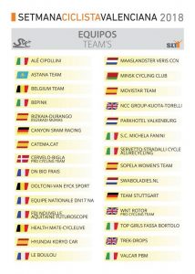 23 enero. La Setmana Valenciana ha hecho pública hoy la lista de 30 equipos que formarán el pelotón de su edición de 2018.