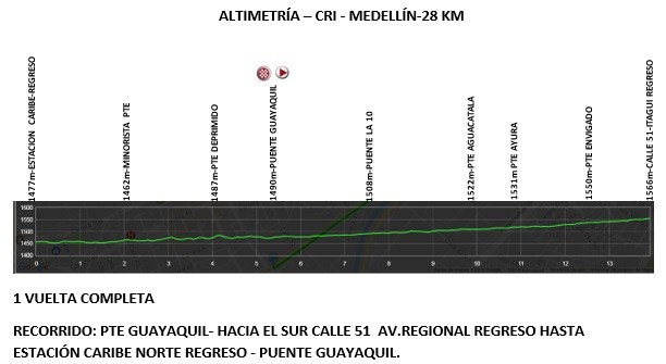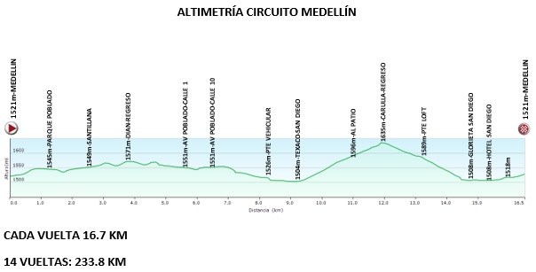 16 enero. La Federación Colombiana de Ciclismo ha confirmado hoy el recorrido del Campeonato Nacional que se disputará en Medellín a partir del día 1 de febrero. La CRI se disputará sobre un trazado de 28 kilómetros con salida y regreso al Puente Guayaquil, tomando la Autopista Sur hasta Itagüí. La prueba de fondo será un auténtico reto para los aspirantes al tricolor nacional. Consta de un total de 233.8 kilómetros, que se recorrerán en 14 vueltas a un circuito de 16.7 km. La carrera parte y llega a la Avenida El Poblado, y tendrá como principal dificultad el ascenso de 2.5 km por la Vía Las Palmas.