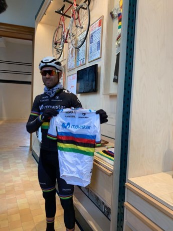 3 abril. Aprovechando su participación en la A Través de Flandes, el campeón del mundo, Alejandro Valverde (Movistar), ha donado un maillot arcoíris al Museo de la Bicicleta de Roeselare.