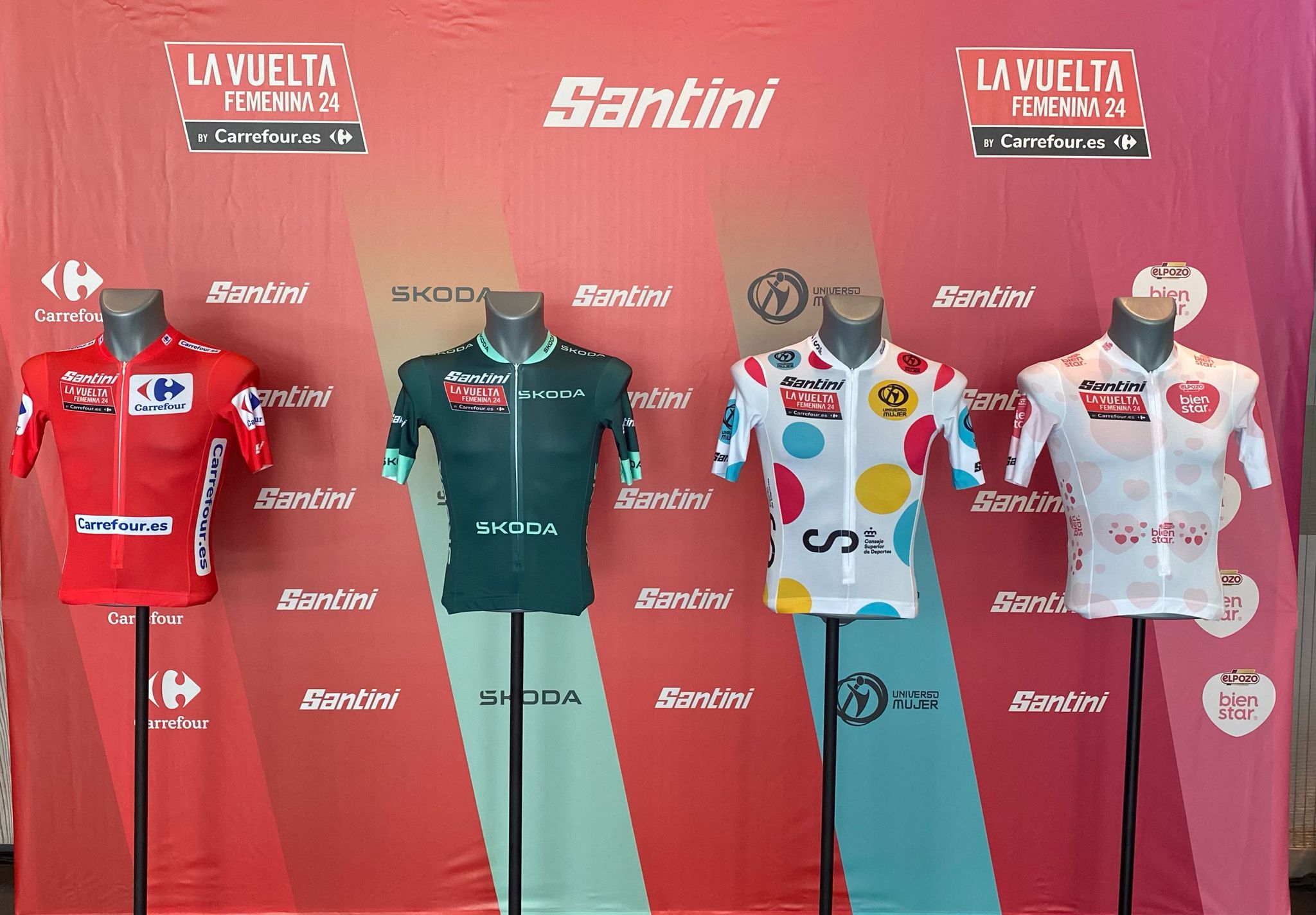 10 abril. Unipublic ha presentado este miércoles los diseños de los maillots de líderes de las cuatro clasificaciones principales de la Vuelta a España 2024, tanto masculina y femenina (general por tiempos, regularidad o puntos, mejor escalador y mejor joven). Se mantienen los colores de la pasada temporada, con las tonalidades habituales en la prueba de hombres –manteniendo el renovado maillot verde más oscuro– y la estética renovadora de las prendas de féminas que se estrenaron hace un año –montaña con puntos azules, amarillos y rojos y mejor joven con tonos rojos tras el blanco-.