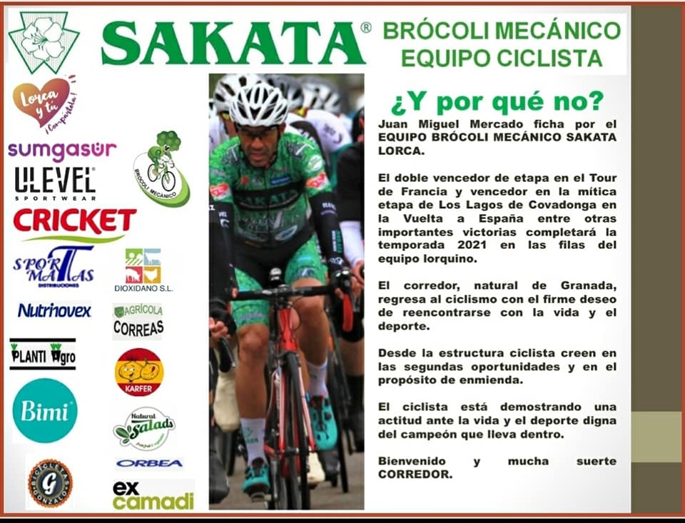 23 marzo. Juanmi Mercado ha reaparecido en el pelotón elite español a los 42 años de edad tras haber sido fichado por el conjunto murciano Brócoli Mecánico-Sakata Ibérica-Lorca con «el firme deseo de reencontrarse con la vida y el deporte». Compitió en el GP San José de Astillero cántabro terminando el 24º a 4 segundos del vencedor. El andaluz fue noticia en febrero de 2020 por haber sido investigado por una oleada de robos en la provincia de Granada. El exprofesional granadino se retiró en 2007 con el Agritubel francés después de diez temporadas en la máxima categoría debutando en el Vitalicio Seguros y pasando por ibanesto.com y QuickStep con los que ganó 13 carreras, entre ellas dos etapas del Tour de Francia y una en la Vuelta a España 2001 en los Lagos de Covadonga.