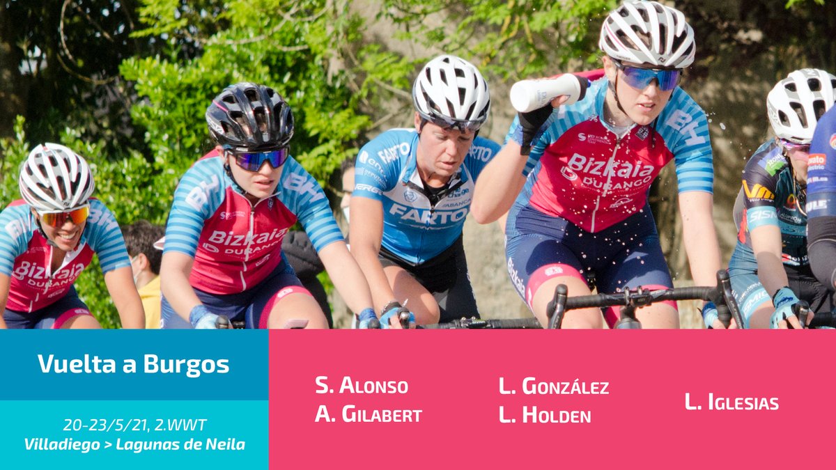 18 mayo. Desde este jueves 20 y hasta el domingo, 23 de mayo, Bizkaia-Durango competirá en la segunda edición internacional de la Vuelta a Burgos, que esta temporada estrena categoría WorldTour en el calendario de la UCI. En la prueba burgalesa competirá con Sandra Alonso, Ariana Gilabert, Lucía González, Lizzie Holden y Lydia Iglesias. No podrá ser de la partida Mer Carmona, quien sufrió una dura caída ayer en la Durango-Durango y presenta una fractura de olécranon y contusiones en las costillas que la apartarán de las carreteras durante un tiempo.
