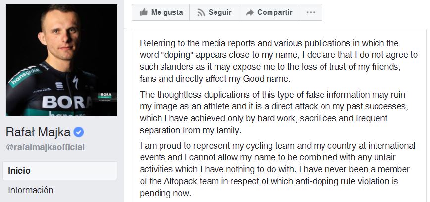 «La difusión de este tipo de información falsa pone en peligro mi imagen como atleta y es un ataque a mis éxitos anteriores, que he logrado únicamente con trabajo duro, sacrificio y frecuente separación de mi familia», añade. «Estoy orgulloso de representar a mi equipo ciclista y a mi país en eventos internacionales y no puedo permitir que mi nombre sea mezclado con actividades turbias con las que no tengo nada que ver. Nunca he sido miembro del equipo Altopack, que actualmente está siendo investigado por violación de las normas antidoping», concluye.