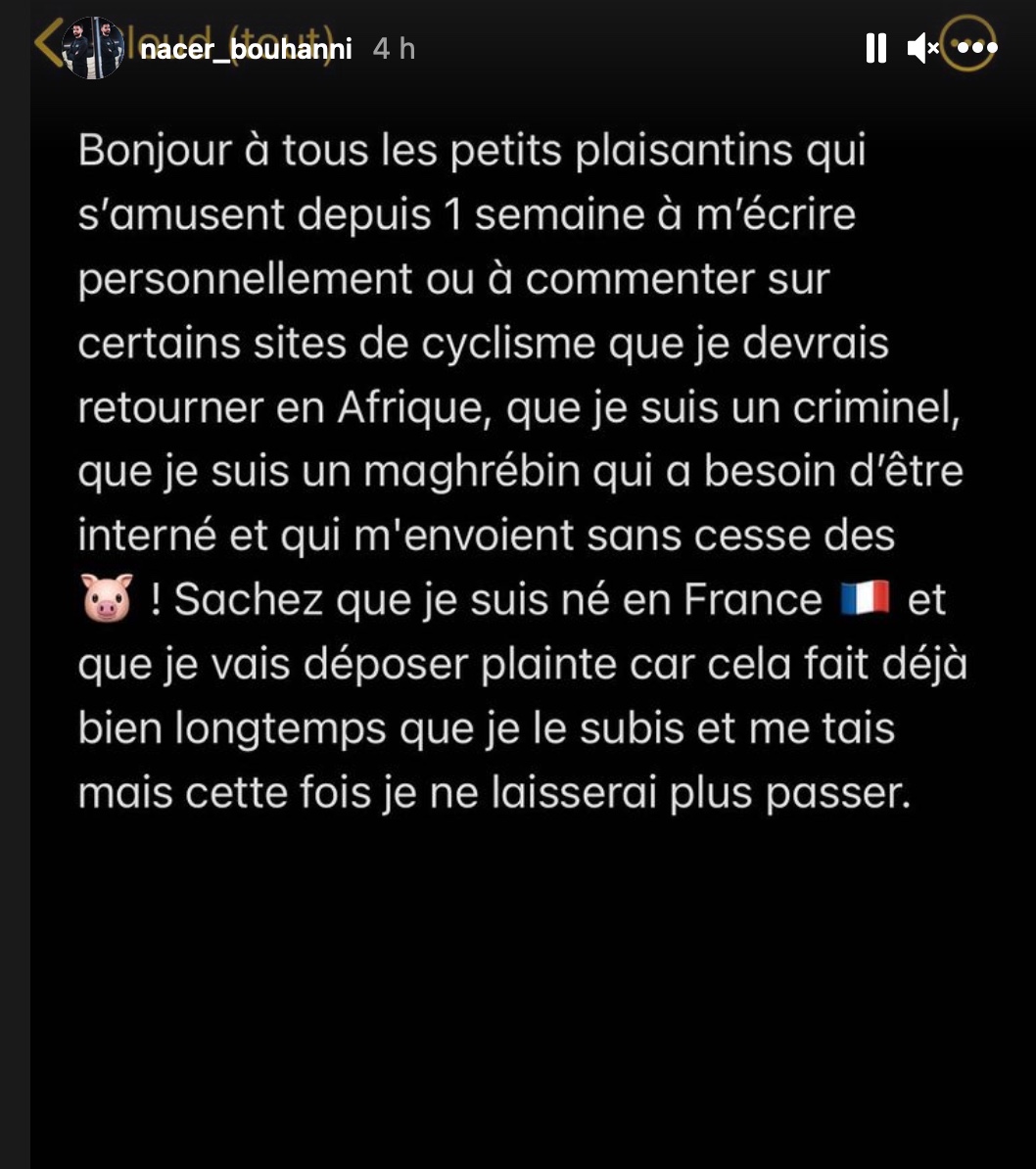 Horas más tarde, el Arkéa emitió un escueto comunicado sobre la cuestión: «Nacer Bouhanni lleva más de una semana siendo objeto de violentos ataques de carácter racista, especialmente en las redes sociales. Ha decidido presentar una denuncia. El equipo de Arkéa-Samsic lamenta y denuncia firmemente estos actos de racismo y ofrece todo su apoyo a Nacer Bouhanni».