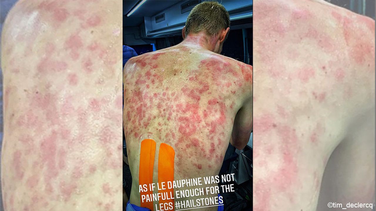 13 agosto. Tremenda granizada tras la segunda etapa del Critériun du Dauphiné en el Col de Porte, final de la jornada donde se impuso el esloveno Primoz Roglic. La fuerte lluvia se transformó en granizo y cubrió a los corredores y la caravana de equipos concentradas en la cima cuando se disponían a descender a los autobuses, que les trasladarían a los respectivos hoteles donde están alojados. Las consecuencias, se pueden ver en la espalda del belga Tim Declercq o el francés Maxime Chevalier (B&B Hotels Vital Concept). El «tractor» del Deceuninck-Quick Step mostraba en una foto los daños ocasionados sobre su espalda amoratada de los constantes golpes de los granizos.