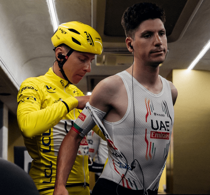 3 diciembre. El nuevo maillot del INEOS Grenadiers para la temporada 2025 ha sido filtrado antes de tiempo. La periodista Emma Bianchi se cruzó con varios corredores del equipo entrenando en España y pudo tomar unas fotografías de ellos utilizando su nueva equipación. En las imágenes publicadas en su perfil de Blue Sky se puede comprobar como el diseño es casi idéntico al de 2024, aunque cambiando los colores de lado. El negro pasa al costado y hombro derecho, mientras que el naranja se sitúa en el lado izquierdo, manteniendo el rojo en el centro. Más llamativa es la inclusión de una franja blanca en el centro del casco. Durante este entrenamiento, en el que INEOS posiblemente estuviera realizando una sesión de fotografías para su uso en 2025, estaba ausente Tom Pidcock, lo que alimenta las teorías relativas a su salida del equipo de cara al próximo año.