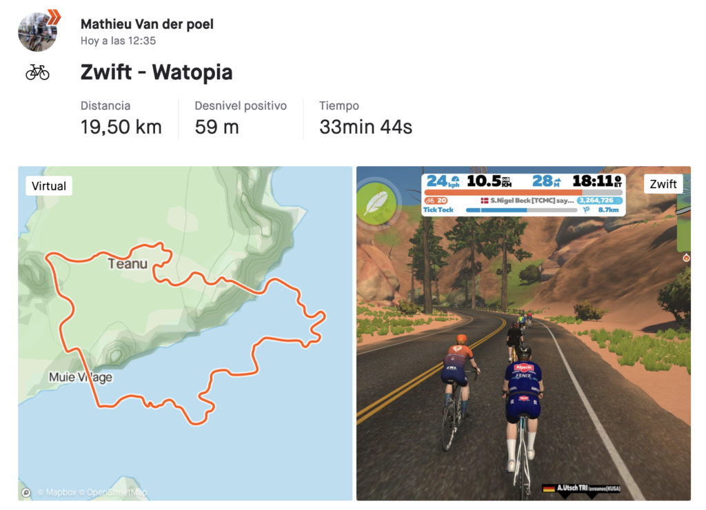 29 enero. Mathieu Van der Poel ha vuelto a la bicicleta después de su operación de rodilla. Eso sí, lo ha hecho desde su casa, encima del rodillo y solo por espacio de media hora en una plataforma virtual aunque a un promedio cercano a los 40 kilómetros por hora. El neerlandés residente en Bélgica ha pasado dos semanas de reposo y ha dado el primer paso de una recuperación sin fecha de vuelta a la competición.