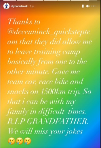 En el mensaje, Stybar agradece la comprensión de su equipo por “permitirme abandonar la concentración de un minuto a otro” y por cederle “un coche del equipo, la bicicleta y comida para un viaje de 1.500 kilómetro para poder estar con mi familia”.
