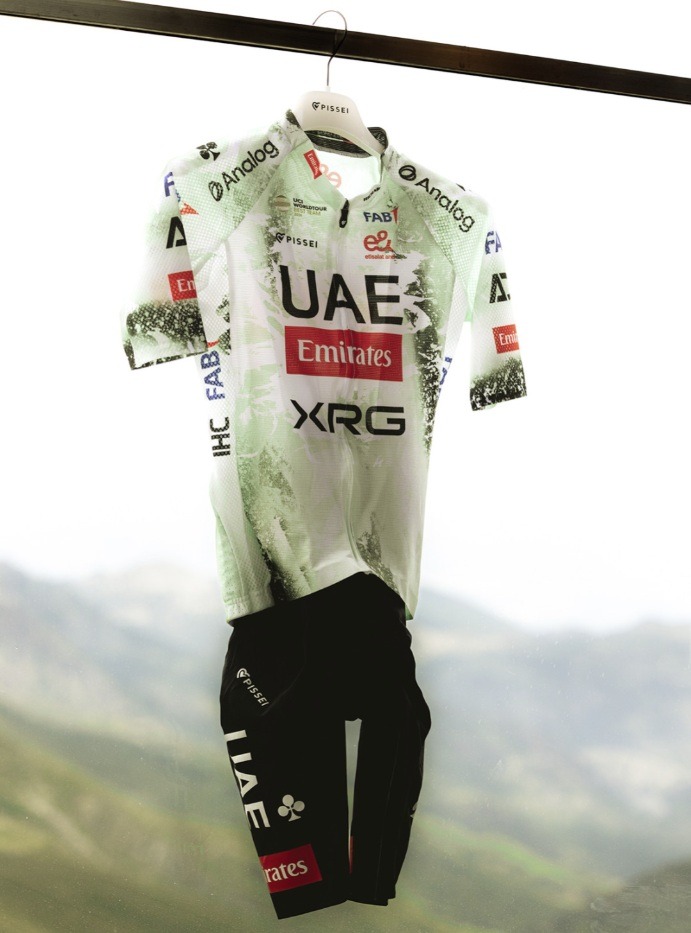 27 junio. El UAE presenta una imagen renovada en la salida del Tour de Francia 2025, que dará comienzo el sábado 5 de julio. El equipo lucirá un nuevo uniforme de competición, también diseñado por Pissei, con una ligera variación cromática respecto al modelo habitual. El blanco sigue siendo el color predominante, pero se incorporan detalles en negro tanto en las mangas como en el torso, aportando un aire más sobrio y elegante.